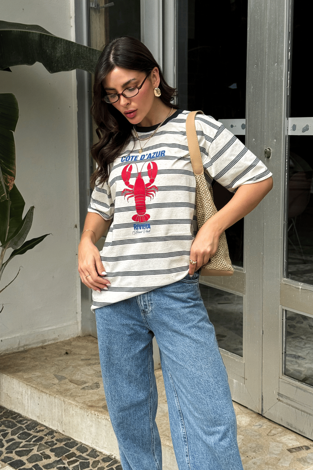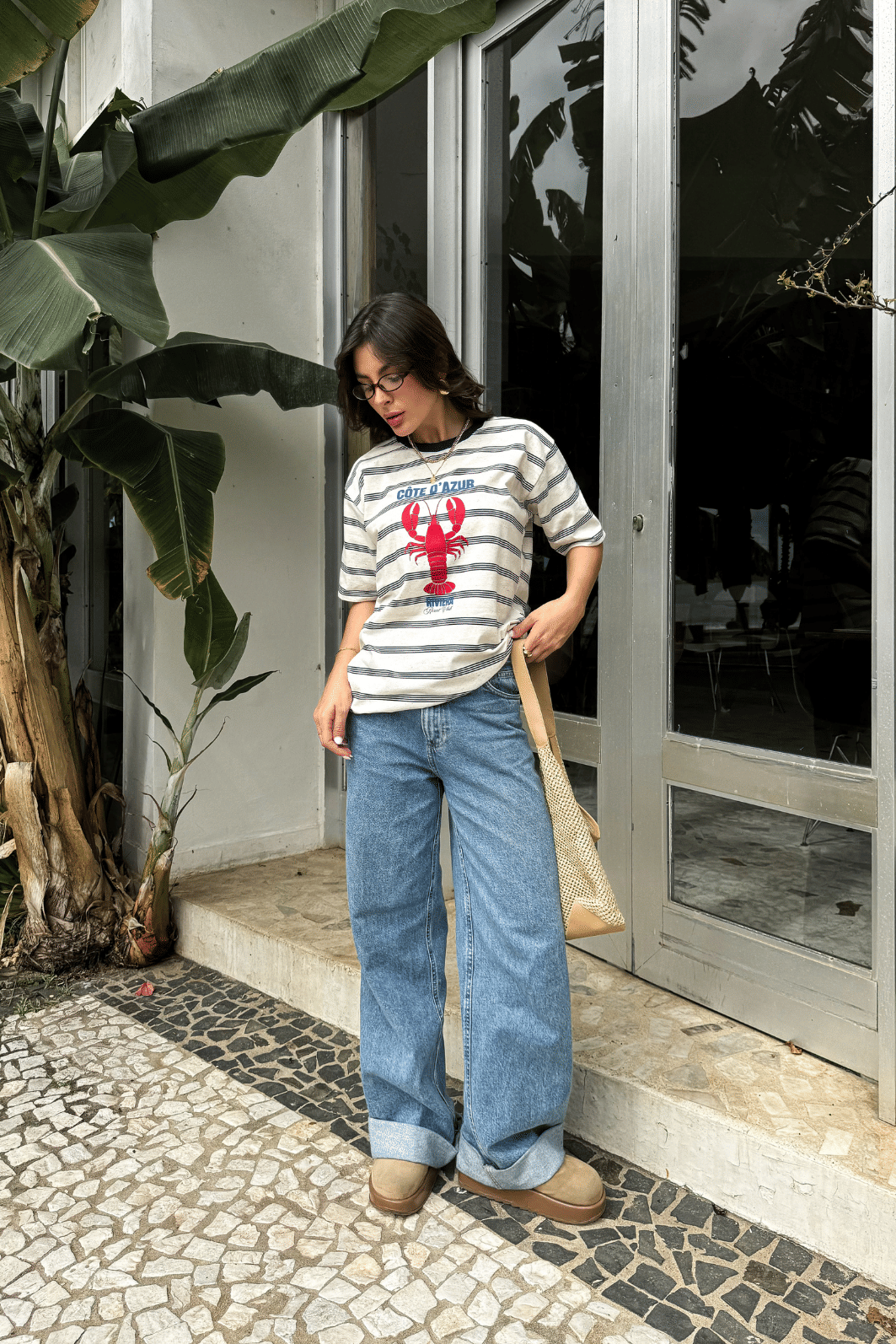 Malha listrada em algodão, estruturada, leve toque macio, modelagem oversized,