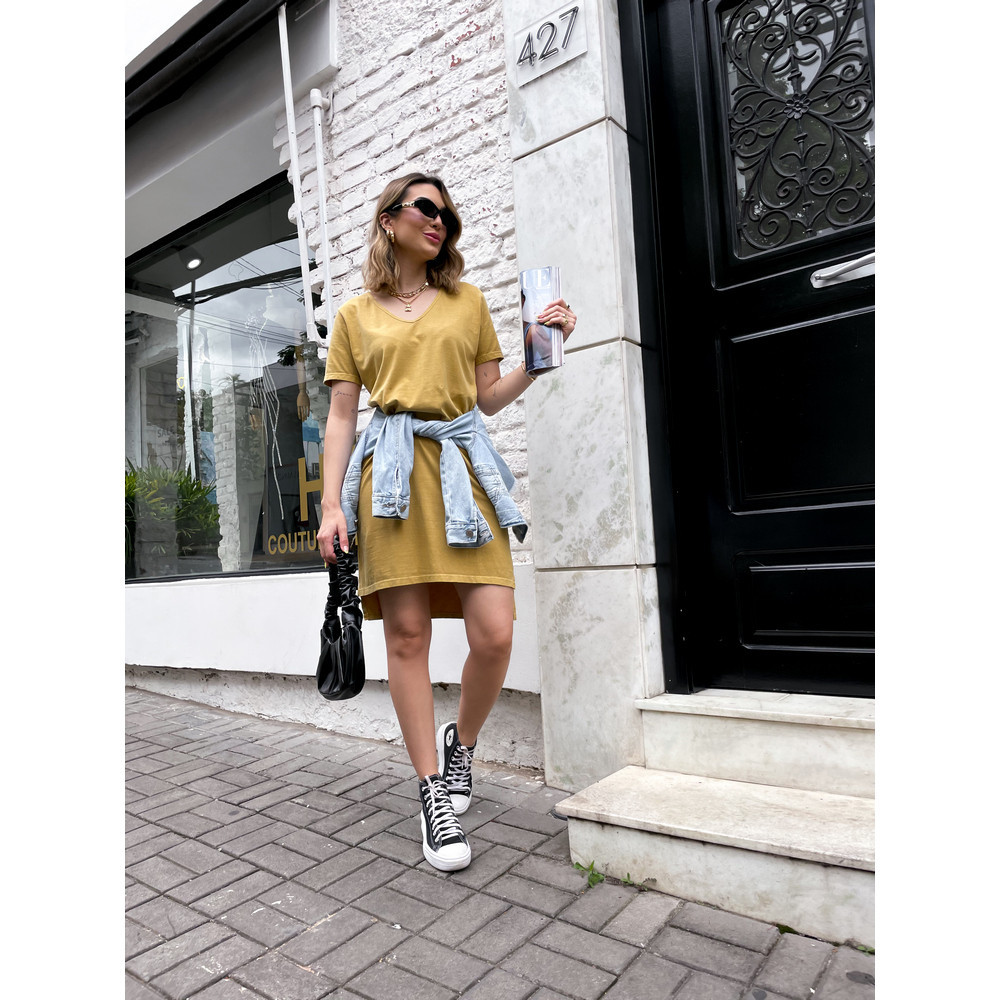 Vestido curto feminino em malha lisa 100% ALGODÃO. Possui modelagem reta, decote em “V” e mangas curtas,